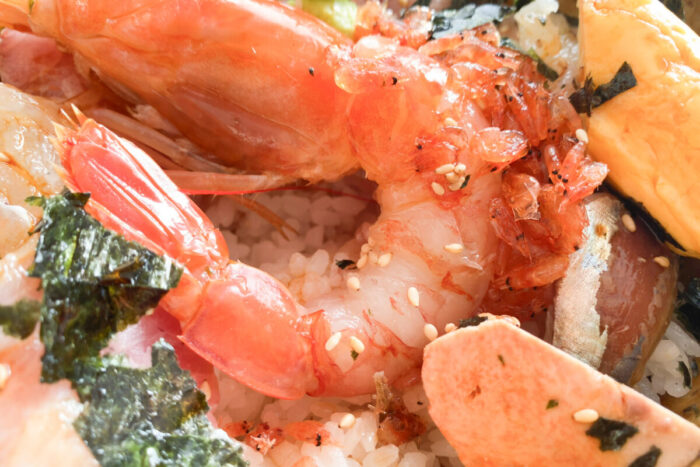 海鮮丼に海老がドドンと乗っているのに、さらにジャンボエビフライまでついてくるとは!