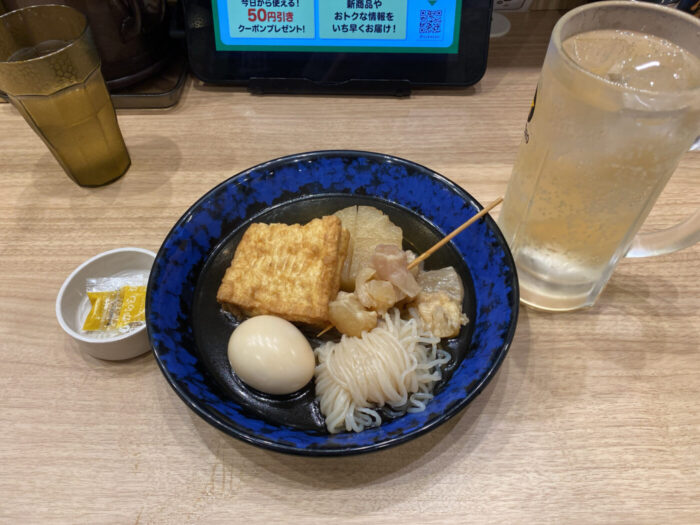 【資さんうどん 三郷店】は、ちょい飲みや、飲みの締めにも最高だった件、おでん5本セットとごぼ天うどんとハイボール