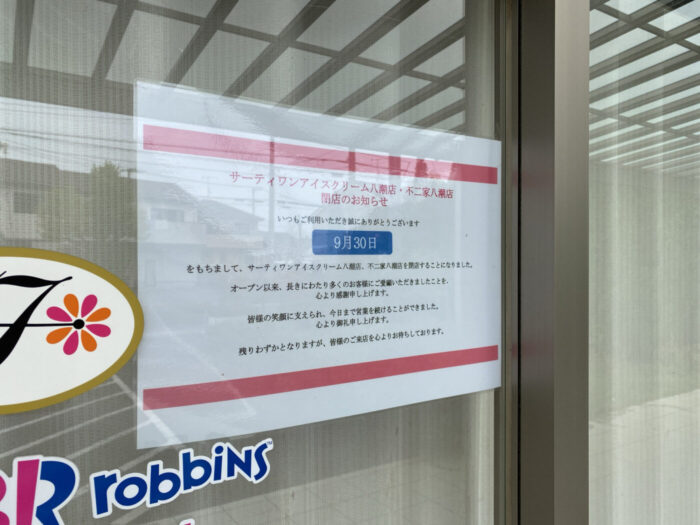 八潮市伊草の「不二家」と「サーティワンアイスクリーム」が9/30(火)をもって閉店されていました。