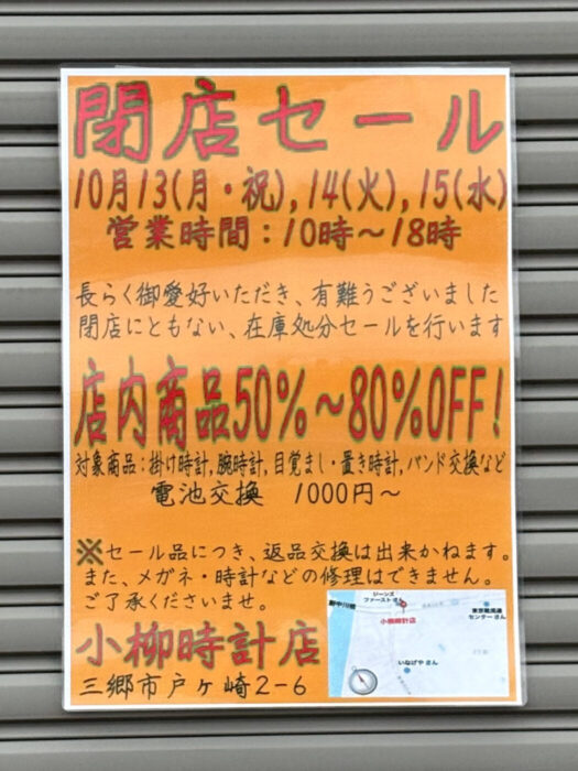 戸ヶ崎2丁目の「小柳時計店」が閉店、10/13(月)〜15(水)閉店セールが開催、店内商品が50〜80%オフ