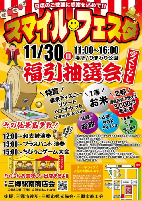 11/30(日)ひまわり公園にて「三郷駅南商店会スマイルフェスタ」が開催、福引抽選会やステージイベント、グルメ出店など