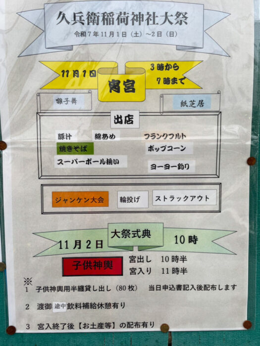 11/1(土)2(日)高州「久兵衛稲荷神社大祭」が開催、神輿に出店、じゃんけん大会などのゲームも