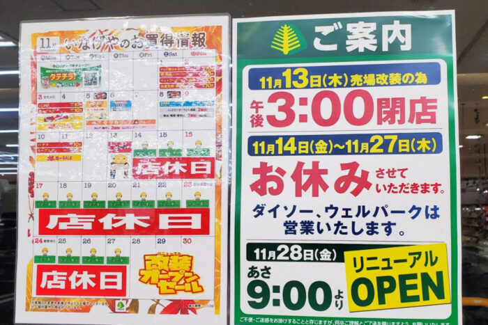11/14(金)〜27(木)まで休業となり、11/28(金)9時リニューアルオープン予定となっています。