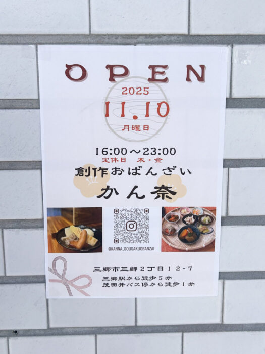 【オープン日決定!】三郷駅南口・三郷2丁目「創作おばんざい かん奈」さん、11/10(月)オープン!
