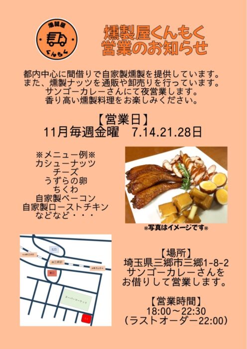 サンゴーカレー三郷/35ダイニングバルにて、燻製専門店「燻製屋くんもく」が11月の毎週金曜日(7日、14日、21日、28日)に夜営業を行っています。