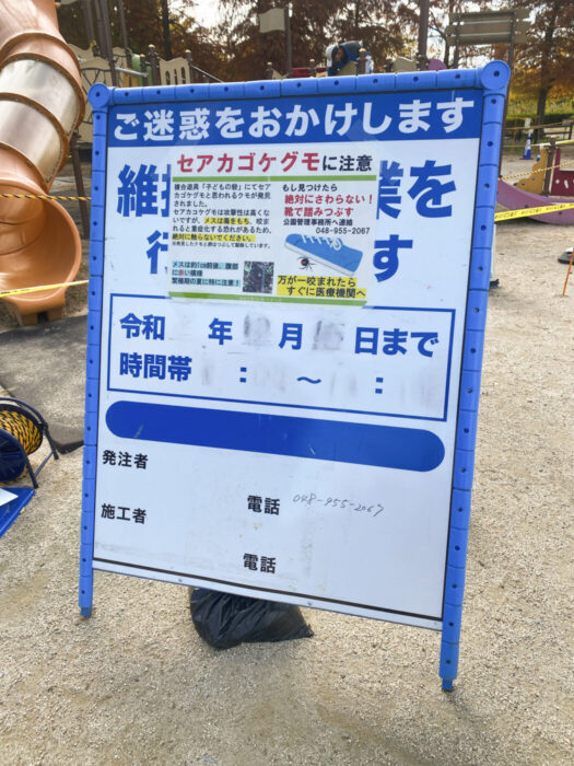 管理者による駆除作業が実施されましたが、11月15日(土)に再度セアカゴケグモが確認されたため、複合遊具「子どもの砦」の利用中止が継続されることになりました。