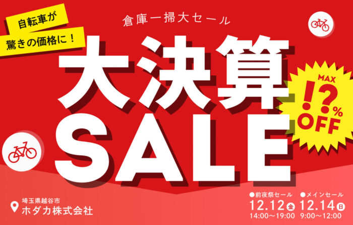 12/12(金)14(日)越谷市のホダカ株式会社にて「倉庫一掃大セール」開催!日本の自転車メーカーがアウトレット品を特別価格で提供