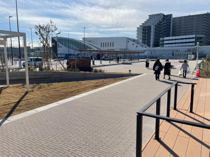 吉川美南駅が見えます。道が広く開放感のある駅前でいいですね。