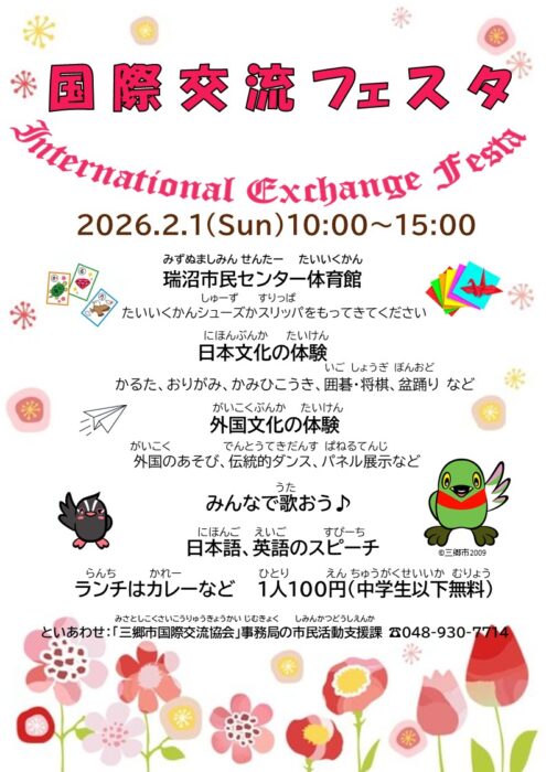 2/1(日)瑞沼市民センター体育館にて「三郷市国際交流フェスタ」が開催されます。