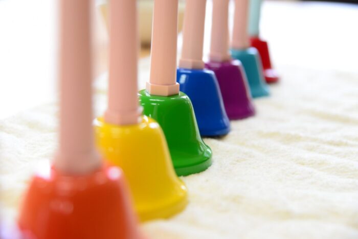 ミュージックベルは本学的な演奏ができるハンドベルの簡易版で初心者にも扱いやすいベルです。複数でメロディーを繋ぎ演奏します。