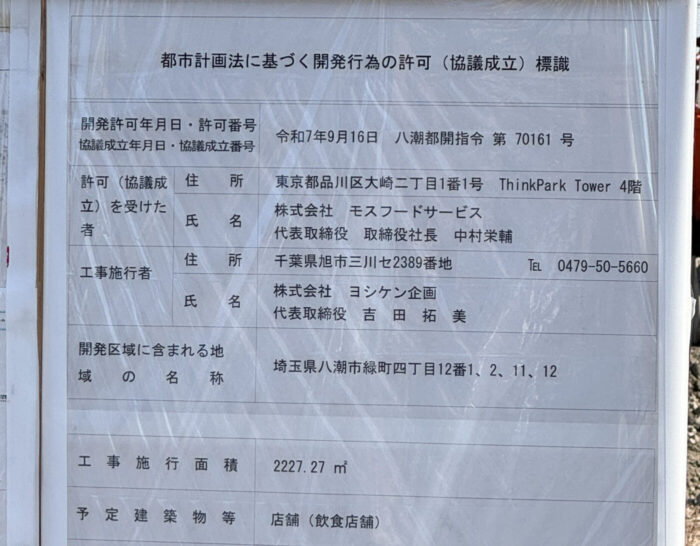 八潮市緑町「珈琲屋OB ログ八潮店」となりに「モスバーガー」の出店計画を発見、春にはオープンか