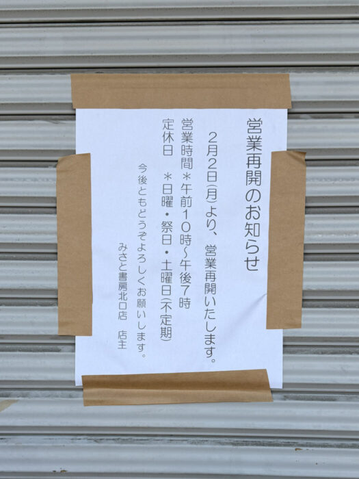 【良かった!】臨時休業されていた三郷駅北口そばの「みさと書房 北口店」2/2(月)から営業を再開