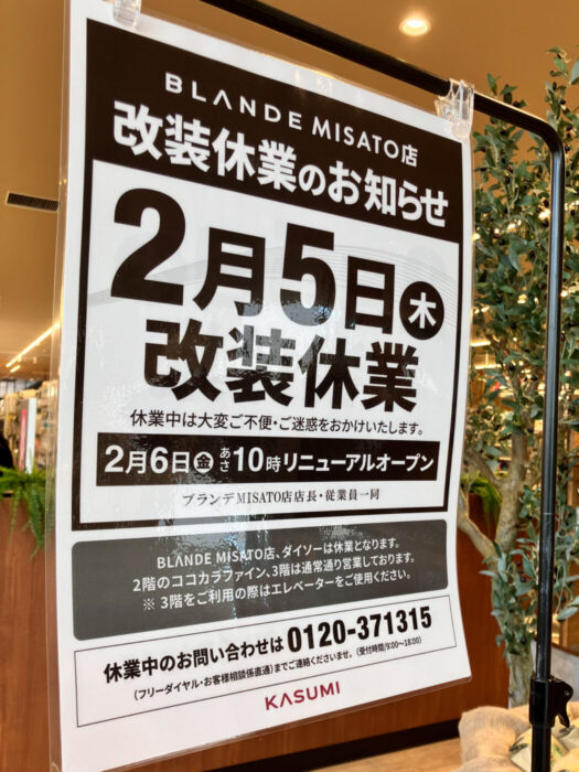 2/5(木)ブランデ三郷が改装ため休業、2/6(金)10時リニューアルオープン予定