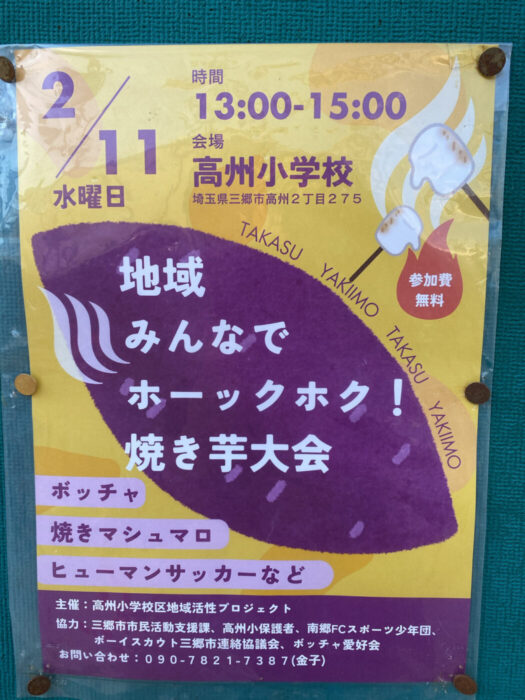 2/11(水・祝)高州小学校にて「地域みんなでホーックホク!焼き芋大会」が開催、参加無料で、ボッチャに焼きマシュマロなど