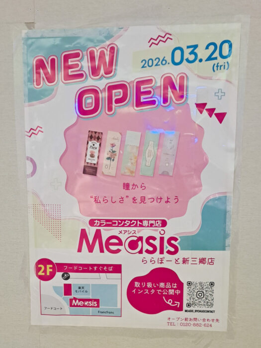 コンタクトレンズ通販サイトで人気の「Measis(メアシス)」が、埼玉県三郷市のららぽーと新三郷に3/20(金)オープンすることが明らかになりました。