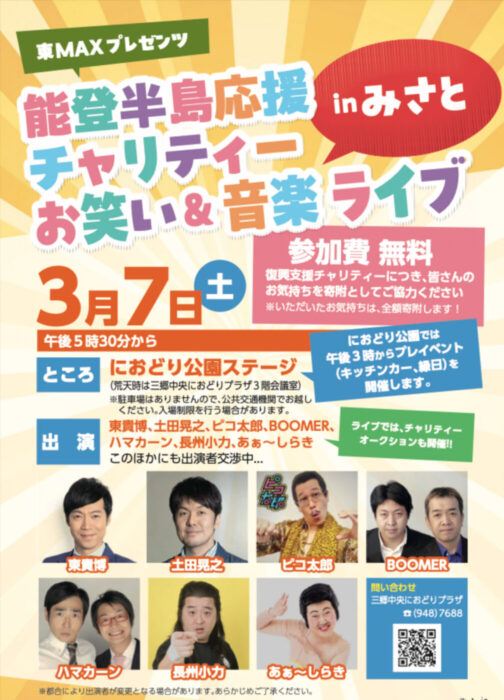 3/7(土)におどり公園にて「能登半島応援チャリティー お笑い&音楽ライブ」が開催、参加無料