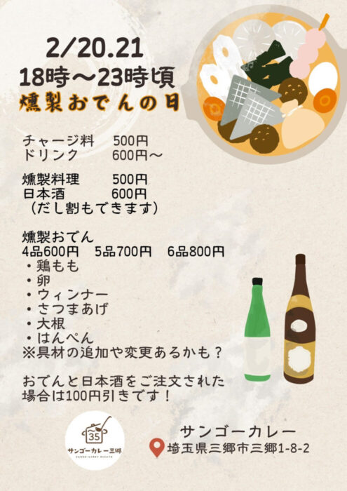 2/20(金)21(土)サンゴーカレー三郷/35ダイニングバルにて「燻製おでんの日」が開催、燻製と日本酒を愉しむ夜