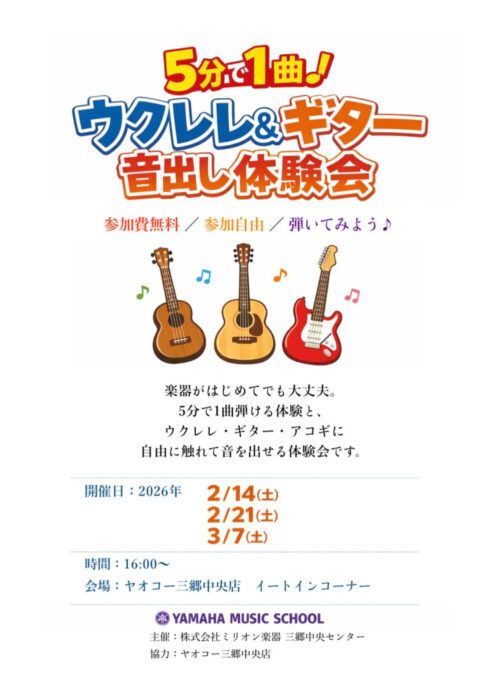 2/21(土)3/7(土)ヤオコー 三郷中央店にて「ヤマハ音楽教室のウクレレ&ギター音出し体験会」が開催されます。