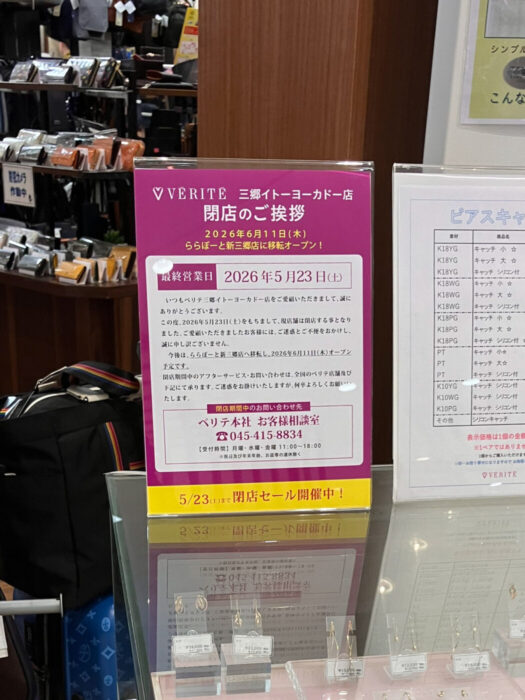 イトーヨーカドー三郷店1階のジュエリーショップ「VERITE(ベリテ)」が5/23(土)をもって閉店される事が分かりました。
