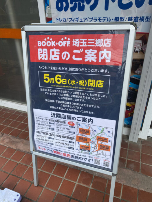 三郷駅南口からすぐの立地で営業してきた「BOOKOFF(ブックオフ) 埼玉三郷店」が、5月6日をもって閉店することが発表されました。