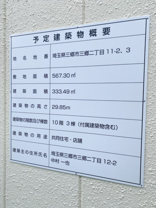 予定建築物概要が掲示されていて、そちらによると10階建て3棟のマンションが建設される予定との事。