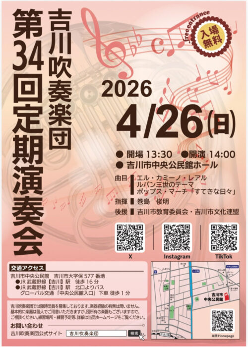 4/26(日)吉川市中央公民館にて吉川吹奏楽団「第34回 定期演奏会」が開催されます。
