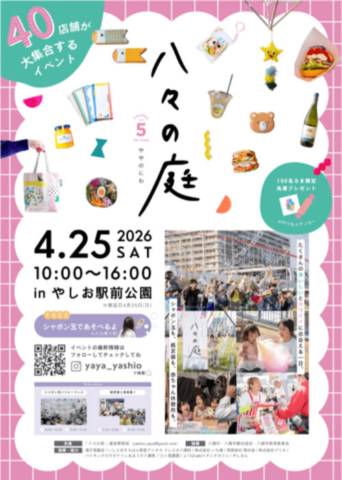4/25(土)やしお駅前公園にて「八々の庭」が開催されますよ。